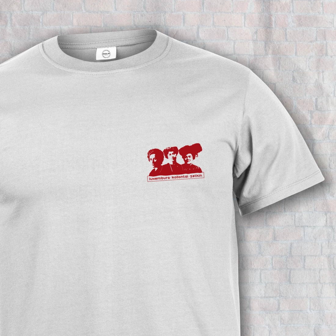 Rosa Luxemburg, Alexandra Kollontai und Clara Zetkin auf der Brust / Schriftzug auf dem Rücken